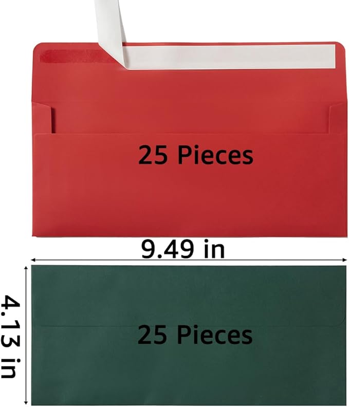 - Including: 50 pieces #10 envelopes(25 Greem+ 25 Red); the Christmas business envelopes of 4.13 x 9.49 inches; meet your holiday needs;