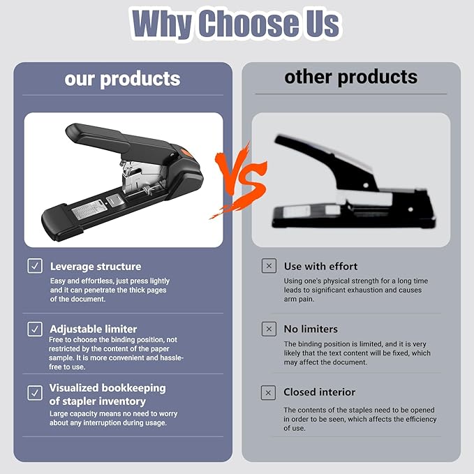 - Labor-saving lever design:This industrial stapler features an ergonomic design and soft grip handle,The handle acts like a lever, so you only need to use a small amount of force to bind thick paper,making high-volume stapling smoother and more comfortable compared to other staplers.
