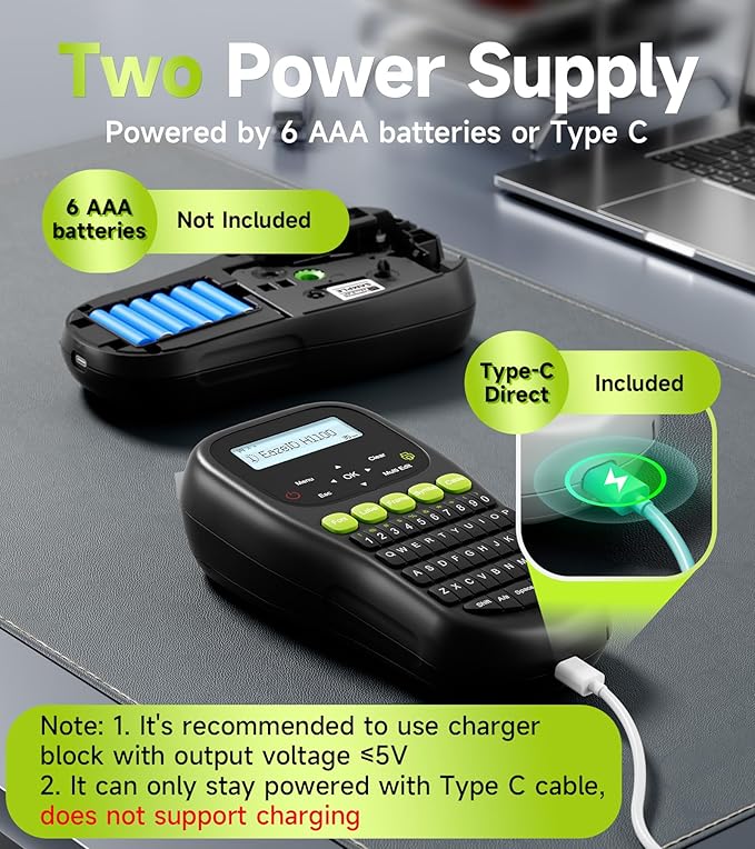 - Environmentally Conscious Labeling : The EazeID H1100 industrial label maker is not only a powerful tool for organization but also an environmentally friendly choice. The label maker uses EazeID Genuine BZ tapes, which are designed to be durable and long-lasting, reducing the need for frequent replacements. These tapes come in acid-free options, ensuring they do not harm your belongings or the environment over time. Additionally, the H1100 model is powered by 6 AAA batteries or an optional Type C cable, allowing you to choose the most sustainable power source based on your usage patterns