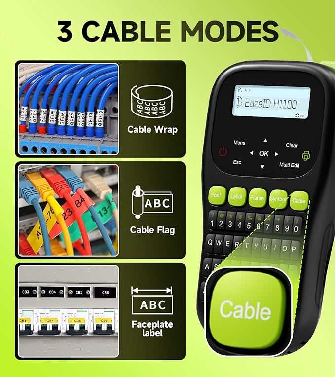 - Multiple Fonts and Symbols for Versatile Labeling : The EazeID H1100 cable label maker offers 21 fonts, 100+ frames, and over 800+ symbols, 22 language, along with an easy-view graphical display for precise preview before printing. This versatility makes it suitable for a wide range of applications, from home improvement to office management. Specialized symbols and frames enhance the visual appeal and functionality of your labels