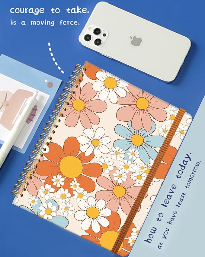 Ruled Spiral Writing Notebook,A5 Hardcover Lined College Journal for Women,Strong Twin-Wire Binding with Premium Paper,8.4" X 6",Perfect for School,Office,Home(Orange Pink Flowers)