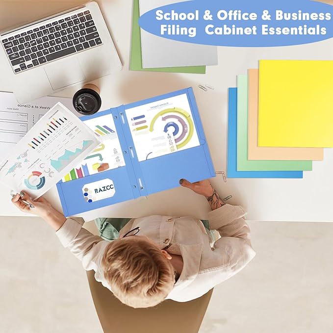 - TWO POCKET FOLDER SET: RAZCC paper file folders with 2 inner pocket, 3 prongs and 2 business card slots. 100 Pack in 10 colors, color-code your notes or documents in these specific colors to keep them organized by subject or project