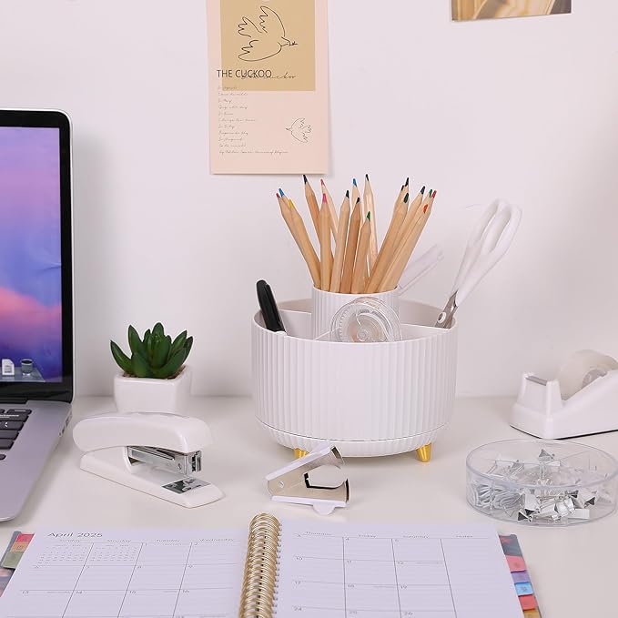 - Desk Organizers and Accessories Set:White Office Supplies set includes a variety of essential office items,1 x 360-degree rotating pen holders, 1 x staplers, 1 x staple removers, 1000 x staples, 1 x scissors,1 x rulers,1 x tape dispenser, binder clips & paper clips & push pins kit, 2 x tapes.This rich content make your workspace convenient and efficient.