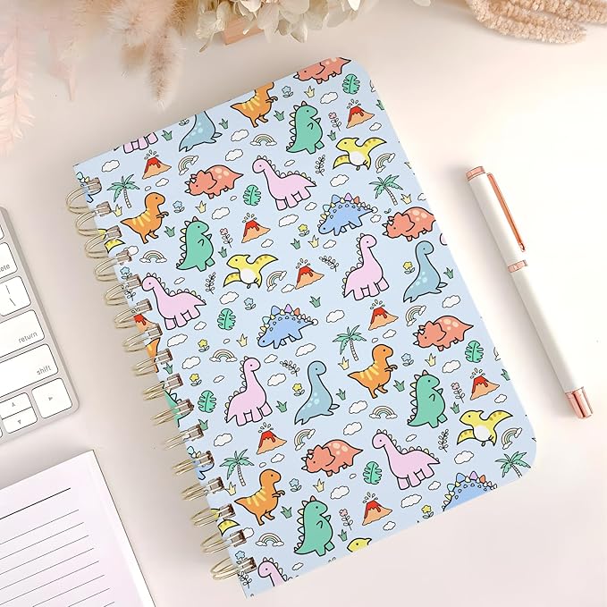 Cute Spiral Notebook journal A5 Aesthetic Pretty Floral Design for Women Girls Kawaii with Pocket, 8.5 x 5.7 inch, Blue Dinosaur