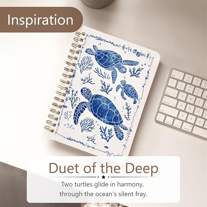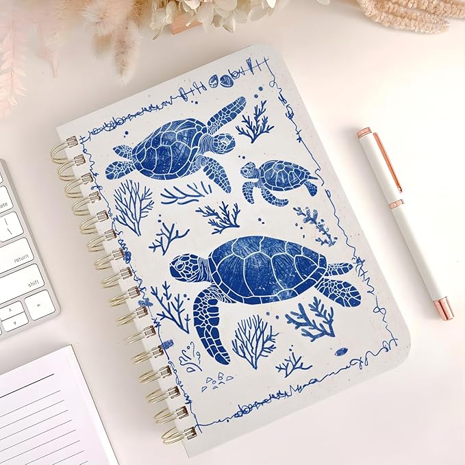 Cute Spiral Notebook journal A5 Aesthetic Pretty Floral Design for Women Girls Kawaii with Pocket, 8.5 x 5.7 inch, Turtle