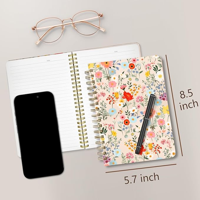 Cute Spiral Notebook journal A5 Aesthetic Pretty Floral Design for Women Girls Kawaii with Pocket, 8.5 x 5.7 inch, Yellow Floral