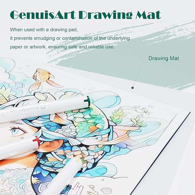 - Bleeding Prevent Drawing Mat: GenuisArt Markers set equips with a silicone Drawing Mat. Before drawing, Placed under the paper to be painted, it can protect your desktop from ink staining and prevent ink leakage.