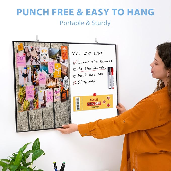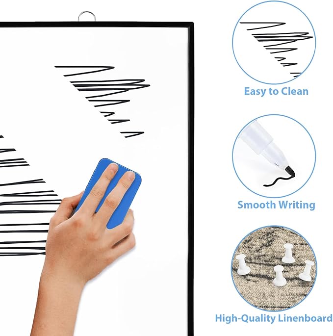 - Premium Quality & Easy to Hang: The erasable white board part is easy for writing and erasing without stains and ghostings. The high-fiber linen surface of the pinboard part is great for pinning notes, messages, pictures, memos and and more. The bulletin board is lightweight but sturdy. It is super easy to hang with two small hooks on the top.