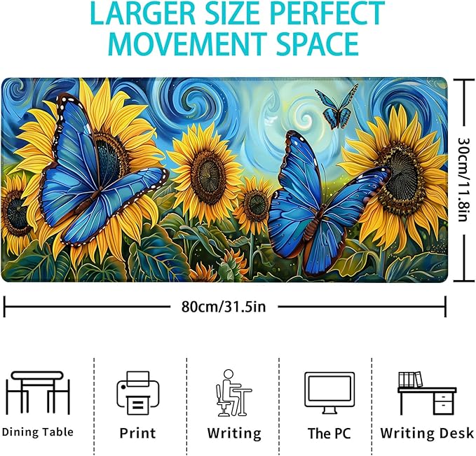 Gaming Mouse Pad, Sunflower and Blue Butterfly Mouse Pad, Desk Mat, Non-Slip Rubber Base MousePads for Computers Laptop Office School Home Accessories Decor 31.5" x 11.8"