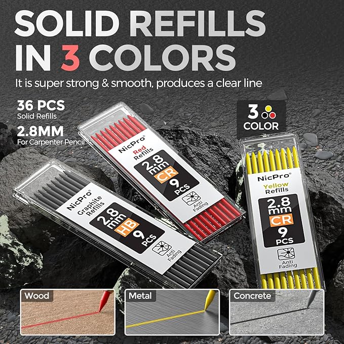 - Marks on Various Surfaces: This work pencil is matched with a 2.8 mm thick color lead, It can mark on a variety of surfaces, including rough, smooth, dry, and wet materials like wood, metal, plastic, and concrete. Making it a standout choice for woodworkers, electricians, and other tradespeople
