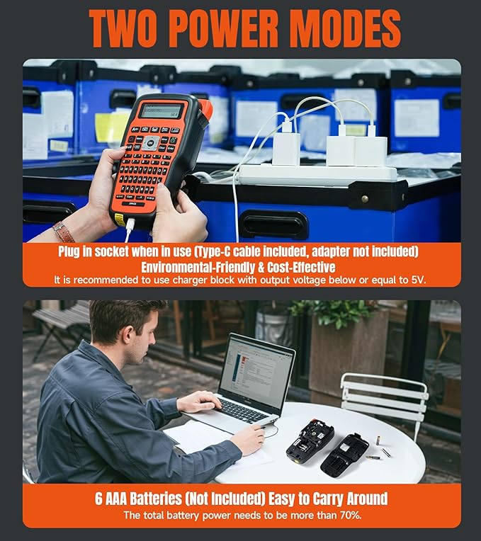 - π§πͺπ’ π£π’πͺππ₯ π π’πππ¦: E1000 handheld labeling machine powered by 6 AAA dry cells (not included) or via USB C cable (included); Print 263 ft (80 m) of label tapes with 6 full-power dry cells