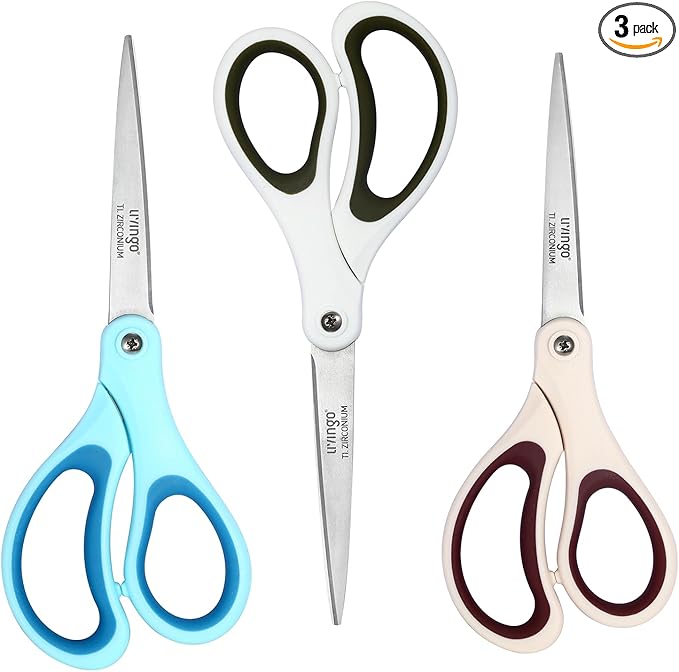 LIVINGO Scissors All Purpose - Titanium Coated Heavy Duty Sharp Stainless Steel Comfortable Shears for Office Home School Cutting Paper Fabric, Sky Blue & Pink & White, 3 Pieces