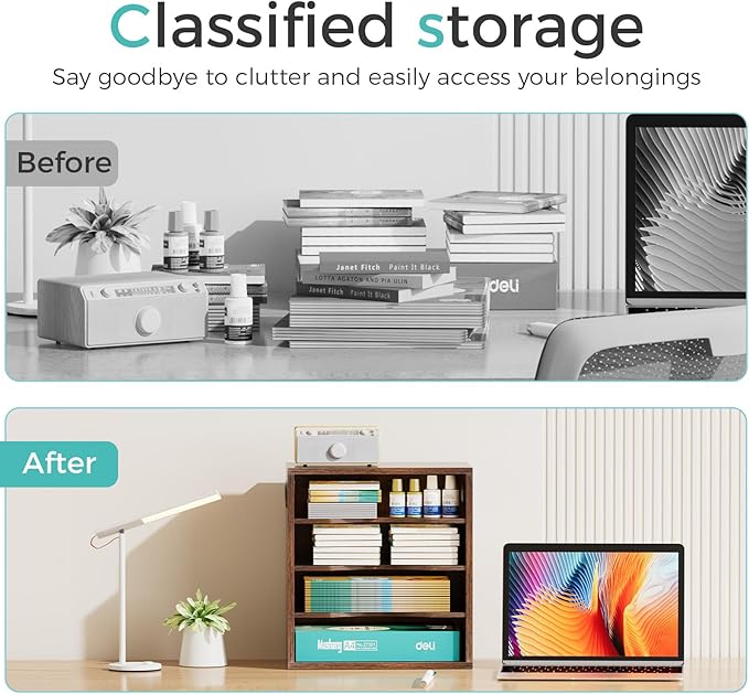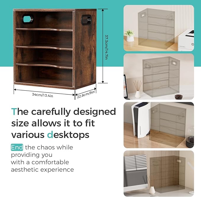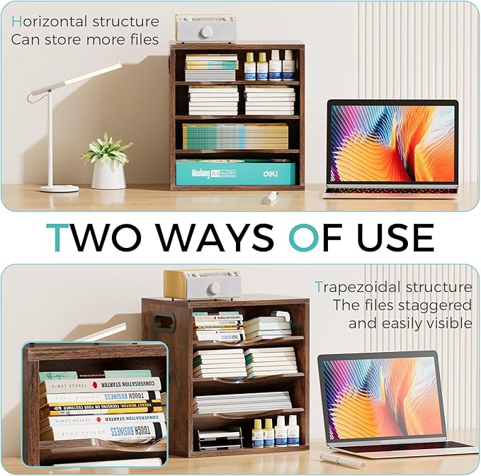 - 【Space-Saving & Safe Construction】Measuring 13.4"L x 9.1"W x 10.6"H, this desktop file organizer occupies minimal space while providing ample storage with 4 tiers and a top shelf. The smooth, exquisite finish and countersunk screws ensure a safe and seamless user experience.