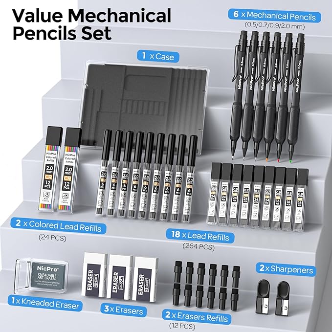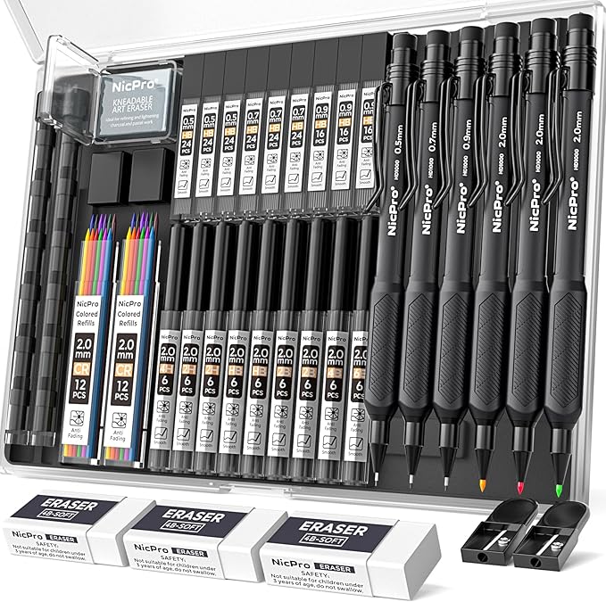 - Comprehensive Stationery Set: Nicpro mechanical pencil kit includes 3 pcs mechanical pencils 0.5, 0.7, 0.9mm, 3 pcs mechanical pencil 2.0. 288 PCS lead refills(4H, 2H, HB, 2B, 4B, 6B black and color), 2 tube of 6 replacement cap eraser refills, 1 pcs kneaded eraser, 3 pcs erasers and 2 pcs sharpeners. It offers everything you need for various writing and drawing tasks, making it a one-stop solution for all your stationary needs
