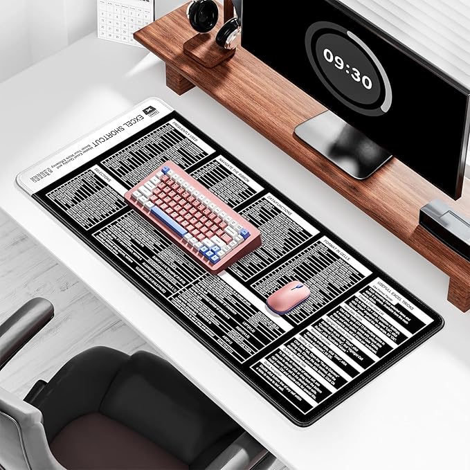 Excel Shortcut Keys Mouse Pad, Large Extended XL XXL Cheat Sheet Gaming Mouse Pad, Office Spreadsheet Desk Mat, Long Big Keyboard Mat, Desk Pad for Desktop, Non-Slip, Stitched, 31.5" x 11.8", Black