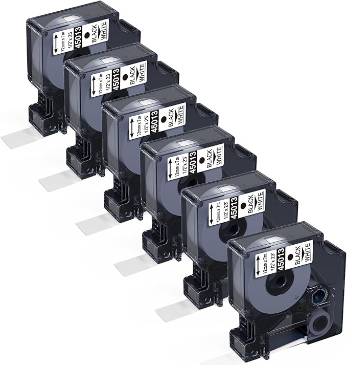 - Package includes:6 Pack Compatible Dymo label maker refills D1 Label Tape 45013 S0720530 - Black on White, 12mm x 7m (1/2 Inch x 23 Ft)