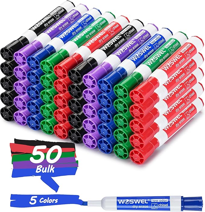 Dry Erase Markers, Chisel Tip Whiteboard Markers, Low Odor Thick Dry Markers, 50 Bulk 5 Assorted Colors (Black/Blue/Red/Green/Purple) for Kids/Teachers, Classroom, Office & Home Use