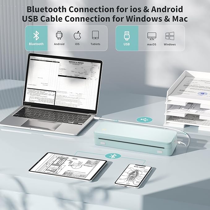 - Portable & Versatile: Designed for on-the-go printing, this lightweight portable thermal printer easily fits in your car or bag. Perfect for contracts, labels, shipping docs, boarding passes, and more, whether at the office or on a business trip.