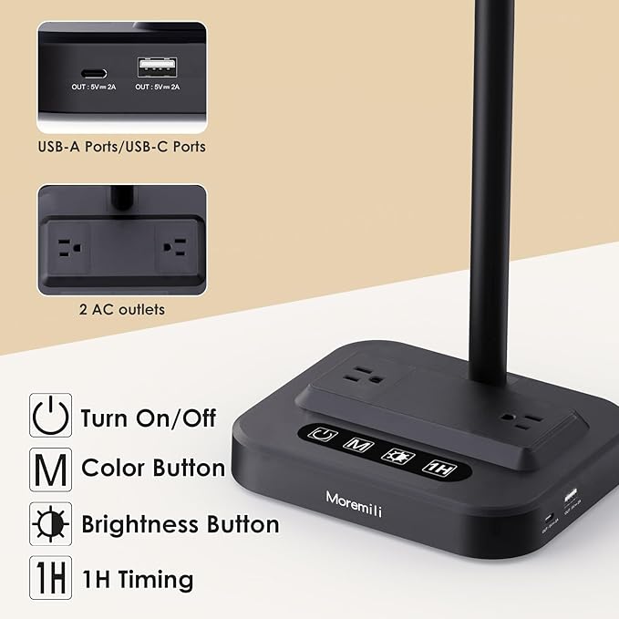 - Power strips with usb ports: Equipped with a Type-C port, a USB-A charging port, and 2 AC outlets, this desk lamp allows you to charge your smartphones, tablets, and laptops all at once, making it a one-stop charging solution for all your devices.