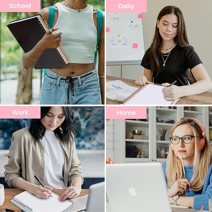 - 【HARDCOVER SPIRAL NOTEBOOK】 Never worry about ruined notes again with this spiral notebook's durable waterproof cardboard cover, protecting your 200 pages of college ruled, 100gsm paper from damage. With 6.1"x8.3" size, 4 golden metal corners, twin-spiral binding, and an information page to prevent loss, you'll have a reliable writing companion for important meetings and school work.