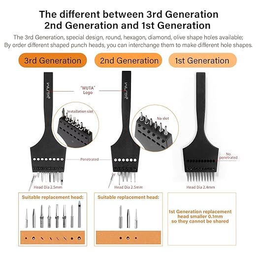 WUTA Leather Stitching Punch, 3nd Removable Round Hole Pricking Irons, Professional Working Hole Punch Tool Set for DIY Leather Craft(3.38mm- 2+5+9 Hole)