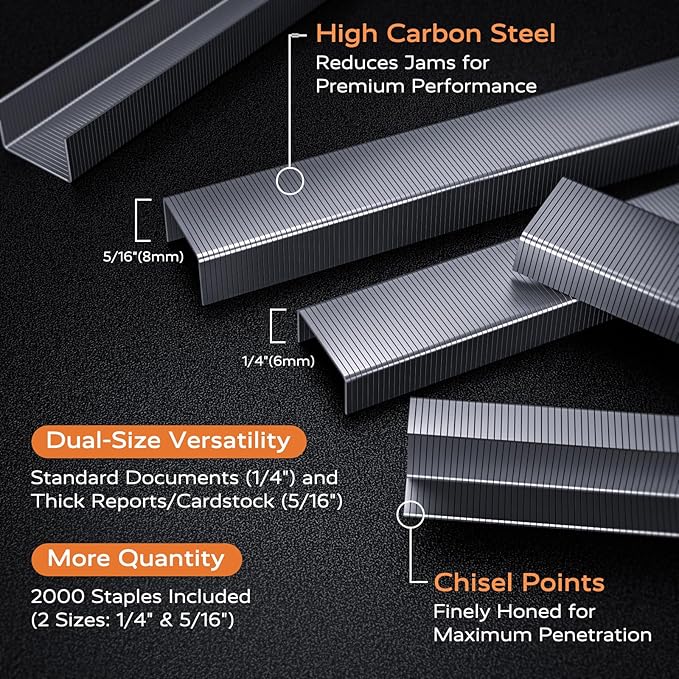 - VALUE PACK: Includes 1,000 standard 1/4" staples (for 20–25 sheets), 1,000 heavy-duty staples (for 40–50 sheets), and a magnetic staple remover for quick and easy removal. The ergonomic handle offers a comfortable grip for effortless use, while the push-style metal tip slides easily under the staples for clean removal without tearing your paper