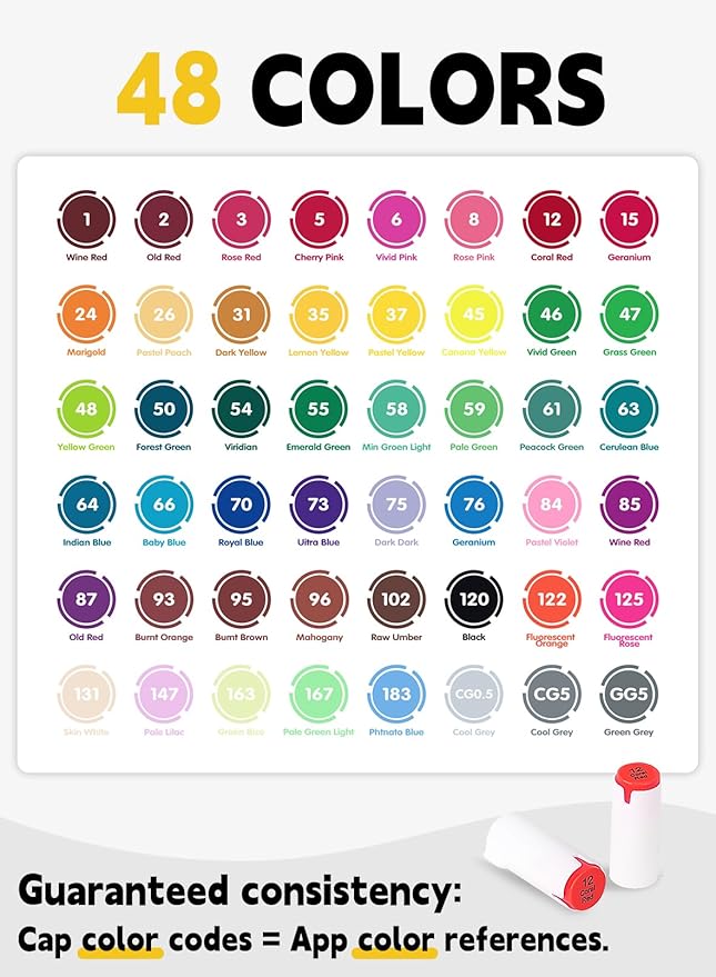 - Special Design : Color-coded caps & portable storage box. Our dual tip alcohol markers with unique color-coded caps make it easy for color identification and organization. Besides, the carrying case allows for convenient creativity on the go. All the special designs help you to easily identify and quickly pick up the coloring markers you need, offering a neat, speedy and hassle-free storage experience