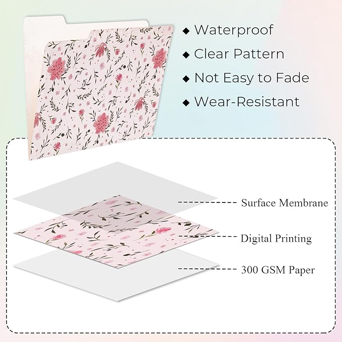 - Heavyweight Material - Decorative file folders are made of 300 GSM recycled paper. Surface membrane technology makes the digital printing pattern of pretty file folders not easy to fade, waterproof, and more wear-resistant