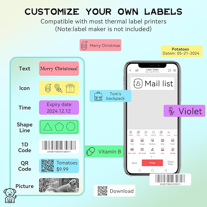 - No Ink Or Toner — Using thermal printing technology to print clearly without ink or ribbon. The printed content can be stored for a long time under normal temperatures. The label paper has strong adhesiveness, no color fade, water-proof, oil-proof, tear-resistant, non-toxic, harmless, and degradable.
