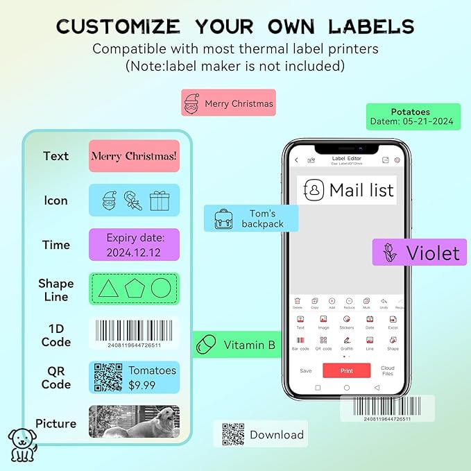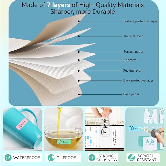 - No Ink Or Toner — Using thermal printing technology to print clearly without ink or ribbon. The printed content can be stored for a long time under normal temperatures. The label paper has strong adhesiveness, no color fade, water-proof, oil-proof, tear-resistant, non-toxic, harmless, and degradable.
