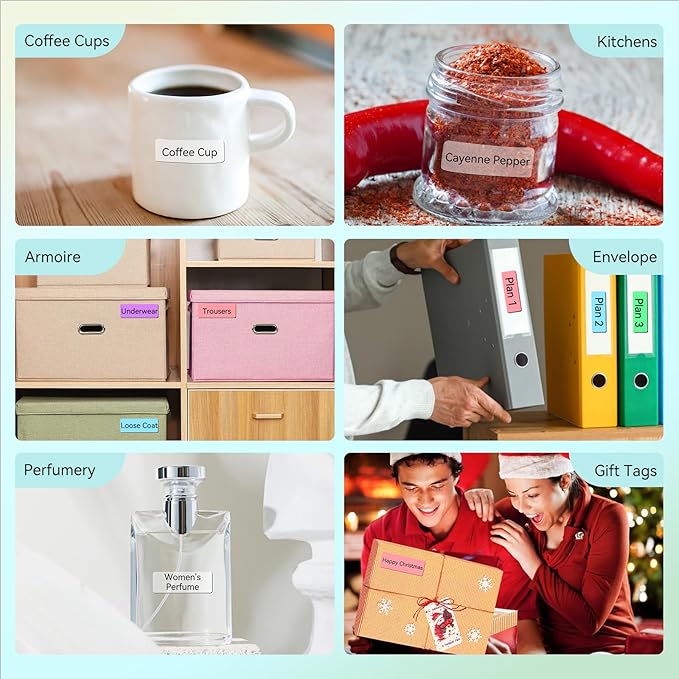 - Label Maker Tape — You could get 10 rolls of labels in total, with sizes 12x40mm (0.47"x1.57"), 165 labels/roll, and 1650pcs in total. It is clear 2 rolls, blue 2 rolls, purple 2 rolls, green 2 rolls, and pink 2 rolls.