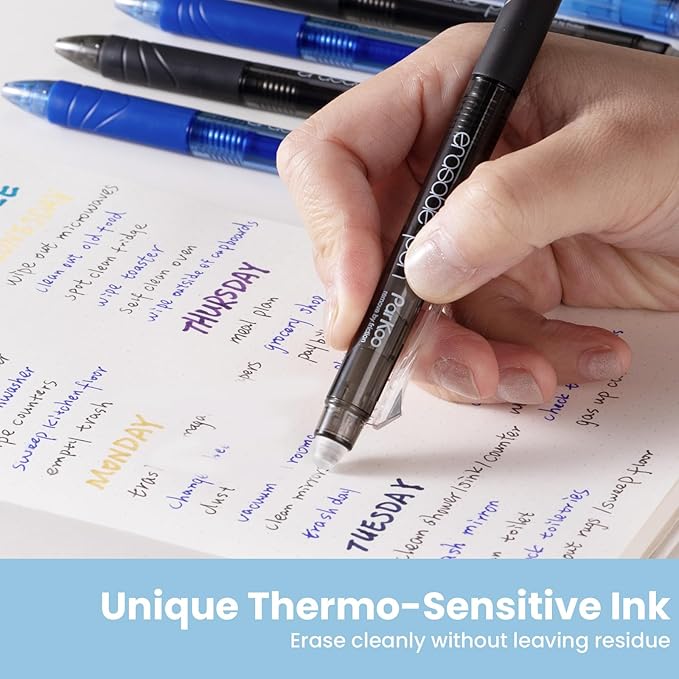 - Easy Correcting: New thermos-sensitive ink that disappears with erasing friction using the rubber eraser on the top of the pen with no residue and no tearing of paper; These pens write like normal gel pens, and erase like pencils