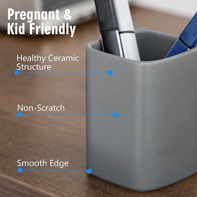 - 【Premium Material】Square pen holder for desk is made from lead-free ceramic, which is fired at high temperature,ensuring its strength and solidity for long-term use