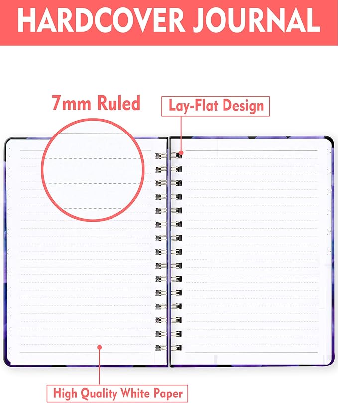 - PREMIUM A5 SPIRAL NOTEBOOK – This spiral-bound notebook includes 120 high-quality, college-ruled pages designed to prevent ink bleed-through, providing a smooth writing experience for all your note-taking and journaling needs.