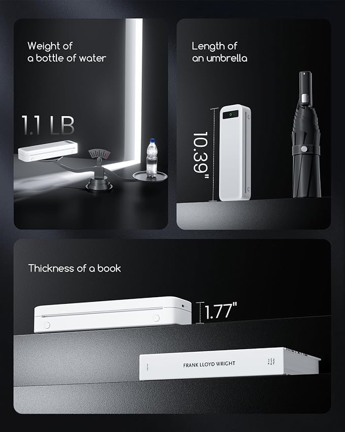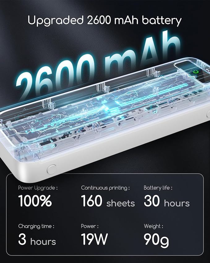 - Portable Printers Wireless for Travel [Compact & Space-saving]: Portable printer built-in 2600mAh rechargeable battery, print 160 sheets of 8.5'' x 11'' thermal paper per charge. Weighs only 1.5lb and is small in size. This inkless portable printer fits easily into a backpack or briefcase! Ideal for on-the-go printing during business travel, in car or truck, small office, construction site, school and home use. You can print documents, contracts, invoices, receipts and boarding passes anytime, anywhere