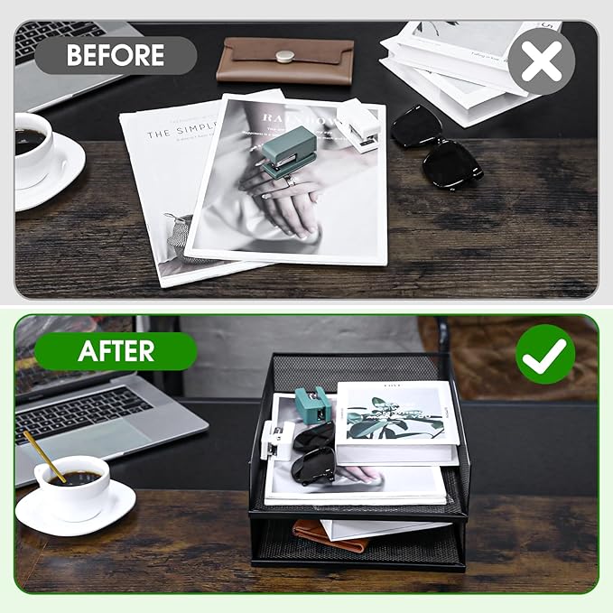 - Space-Saving Design & Easy Accessibility: The two-tiered, stackable design maximizes desk space and enhances organization. The modern metal mesh construction of desk organizer tray offers clear visibility of files and documents, ensuring effortless access and a clean, tidy workspace