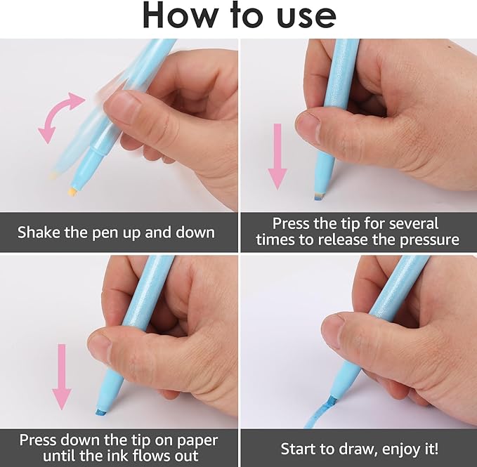 - PRESS INK-OUT TIP: The high quality nylon chisel tip is designed as a press ink-out style. It can control the amount of ink coming out and prevent the ink from drying out. Shaking the pen with the cap on it to mix the ink before using, then take off the cap and press the tip on the paper for several times until the ink comes out. To extend the service life, please remember to recap the markers and place them horizontally after use.