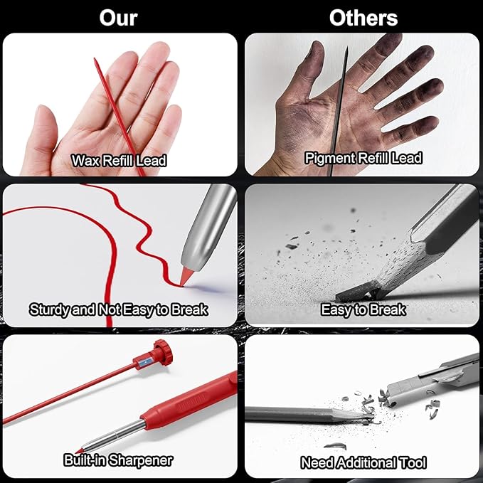 - Deep Hole Marker: The construction pencil has a 45 mm elongated tip design, which can reach narrow areas that other carpenter markers cannot reach for precise marking, improving woodworking efficiency and ensuring accuracy