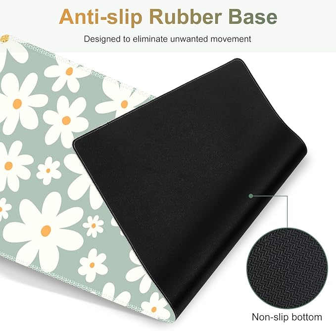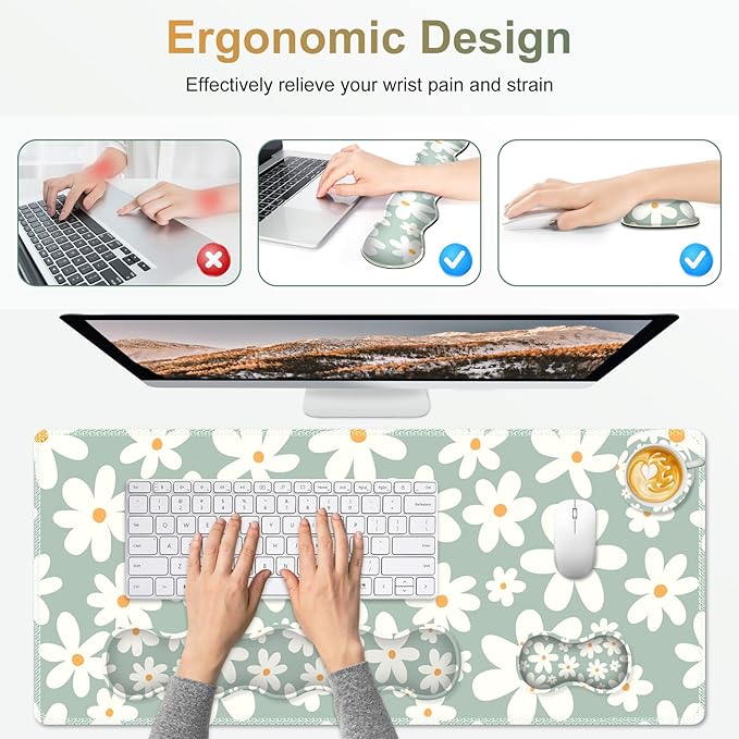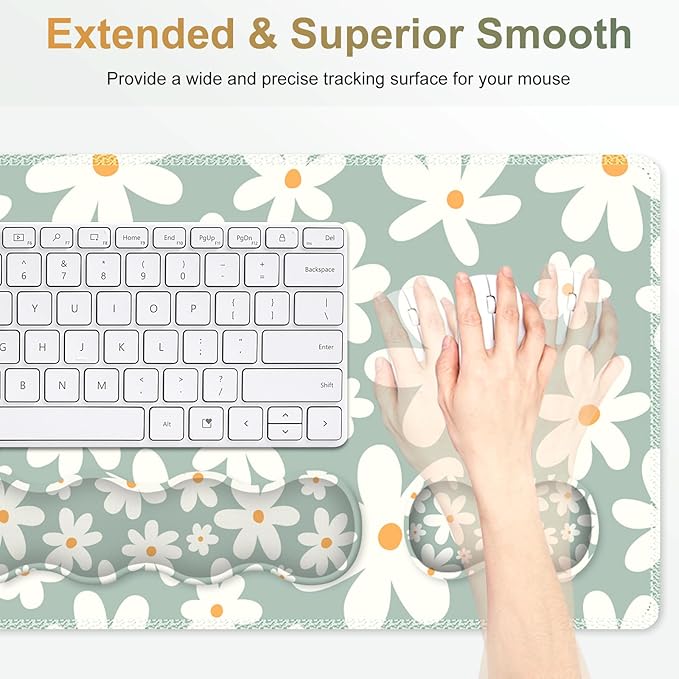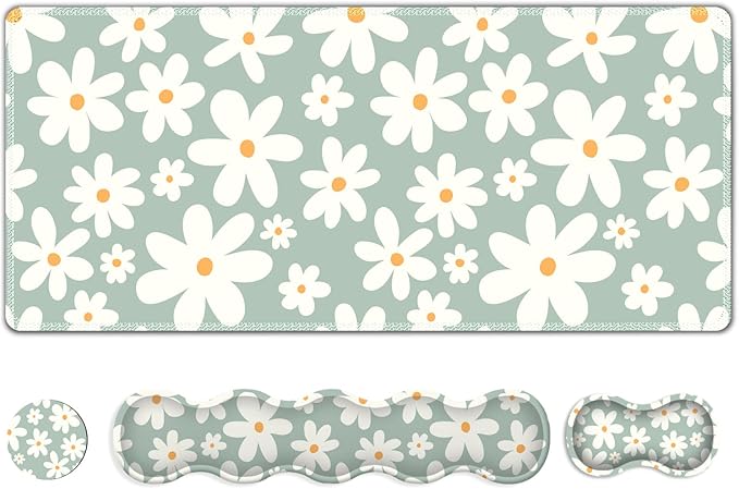Desk Mat Gaming Mouse Pad, Cute Desk Matt Keyboard Wrist Rest for Desktop, Anti-Slip Big Mousepad Stitched Edges, XXL Large Mouse Pad with Wrist Support for Home Office Computer I Morandi Daisy