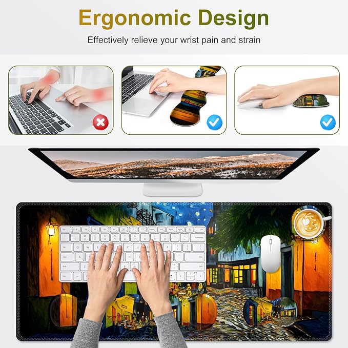 - 【Memory Foam Wrist Support】The curved shape of the wrist rest set filled with memory foam fits perfectly on the wrist. When using the keyboard or mouse, the desk matt for desktop provided the appropriate height of the wrist, keeping your wrist in a natural and comfortable state to relieve the pressure, fatigue and pain from work or study