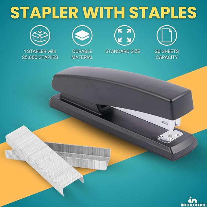 1InTheOffice Stapler with Staples, Office Stapler, 20-Sheet Capacity, 25,000 Standard Staples, Black