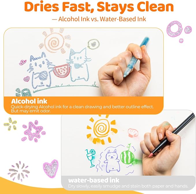 - QUICK-DRYING ALCOHOL-BASED INK: Ohuhu’s alcohol-based ink delivers a significantly sharper double-line effect on paper compared to water-based markers. The ink dries rapidly, preventing smudges and keeping your hands clean. Please note: There may be an initial alcohol scent upon opening; this dissipates quickly with use.