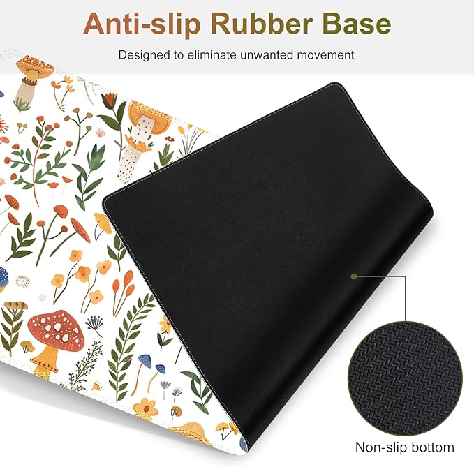 Desk Mat Gaming Mouse Pad, Cute Desk Matt Keyboard Wrist Rest for Desktop, Anti-Slip Mousepad w/Stitched Edges, XXL Large Mouse Pad with Wrist Support for Desk Computer I Mushroom Plant Leave