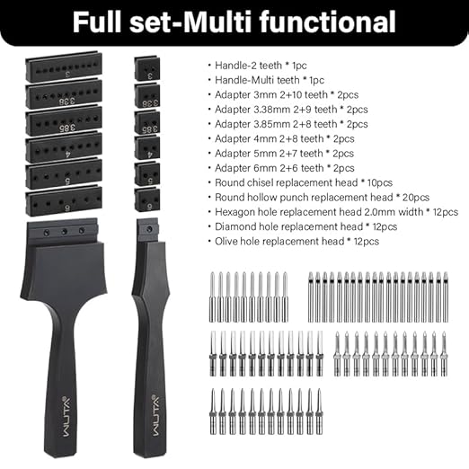 - 【Various hole types】High polished replacement punch heads are removable and replaceable. Various hole types can be interchanged. you could easy to interchange to french style hexagon hole, round chisel hole, round punch hole, diamond hole, olive hole. If the teeth are damaged after use, they can be replaced without changing the handle, which can save costs.Please refer to the pictures for replacement and installation methods。
