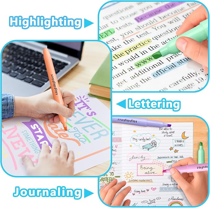 - Multi Purpose Chisel Tip: The chisel tips have two kinds of lines--1mm fine lines and 4mm board lines. Our product can offer broad highlighting and fine underlining. It is very suitable for mark important notes like courses, projects, essays, tests, chapters, dates, textbooks, recipes, readings, etc. Easily mark your important information or content.