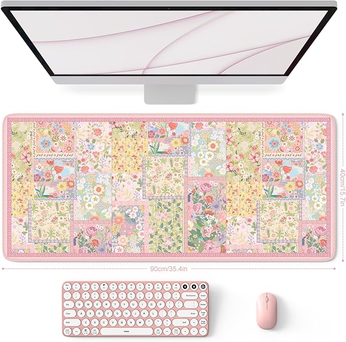 HAOCOO Cute Pink Desk Matt for Desktop, Floral Mouse Pad with Stitched Edge, Desk Protector Mat with Non-Slip Rubber Base, 35.4” x 15.7" Largr Computer Pad for Women Office