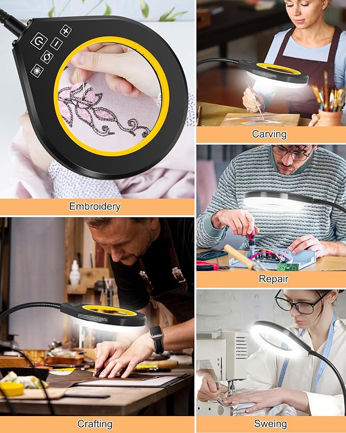 - 【Upgraded Touch & 360° Gooseneck】Upgraded capacitive touch controls 5 lighting modes, while reinforced Gooseneck arm holds any angle for hands-free jewelry repair/cross-stitch. Adjustments anywhere you like it