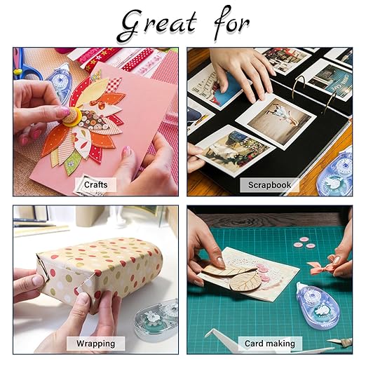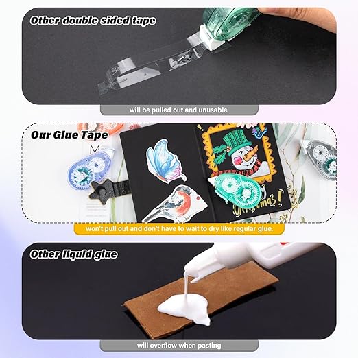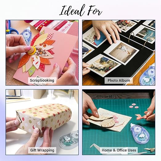 - 【No Mess】 This Value Pack includes 4 pieces of Adhesive Scrapbooking Tape. Unlike traditional scrapbook glue and double-sided tape, which can easily adhere to unintended surfaces like tables and hands, creating a mess, the Scrapbook Tape Roller allows for a clean application of adhesive on any surface. Its design is distinct from regular double sided tape; simply press the glue tape roller's head diagonally onto the paper, pull, and press down to achieve a perfect bond!