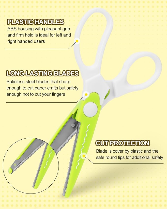 - 5 PAIRS DECORATIVE PAPER EDGE SCISSORS SET - With 1 handle, 5 nice replaceable 2.5” cutting shapes, phthalate free plastic components & stainless steel cutting edges, good for both kids and adults’ art and craft making