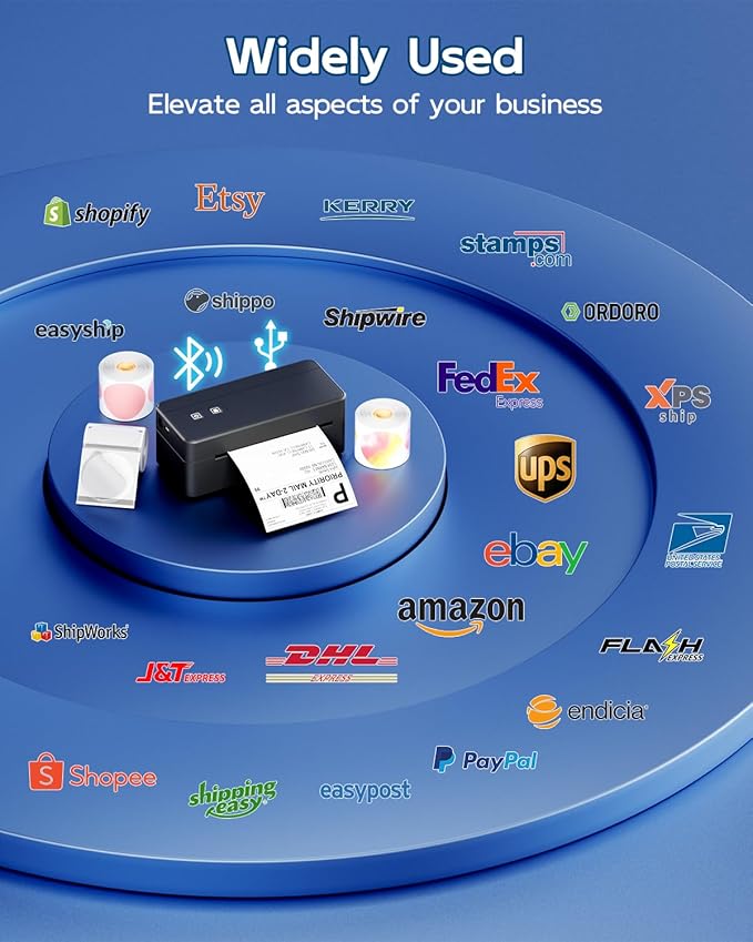 - 【Full Scene Compatibility】2410BT thermal label printer covers label widths ranging from 1 to 4.6 inches and is compatible with major platforms, such as eBay,Tiktok, Shopify, Amazon, USPS, FedEx. With this thermal shipping label printer, you can print shipping/barcode/postal/mailing/address/panrty labels, price tags. Perfect for small business owner and home organization